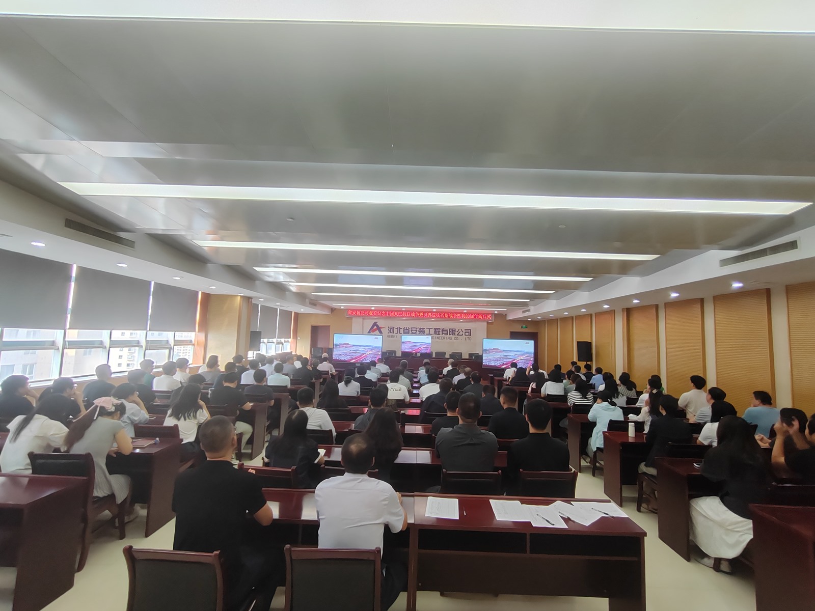 2025年9月3日,為紀念中國人民抗日戰爭暨世界反法西斯戰爭勝利80周年,河北省安裝工程有限公司積極組織職工集中觀看閱兵盛況直播。公司機關及各分公司、項目部共計2000余人通過多種方式同步參與,共同回顧歷史、緬懷先烈、展望未來。上午9時,習近平總書記發表重要講話,9時19分大閱兵正式開始,公司機關及各分公司、項目部會議室座無虛席,職工們們整齊地坐在屏幕前,神情莊重地注視著電視畫面。在閱兵式過程中,